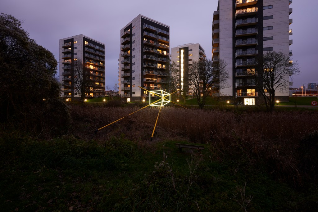 The interplay between the light fixtures and metal structures in each, are unique across the three sculptures. Each sculpture being site specific, for their location.